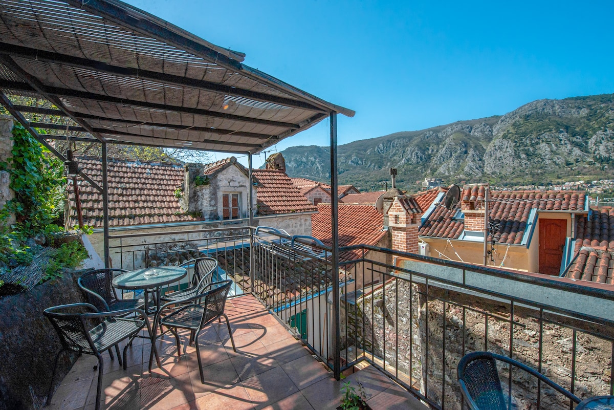 Bright and cosy, elegant studio apartment with fully-equipped kitchenette. Located on the second floor of a medieval stone house in the most picturesque part of Kotor Old Town. The place features a lounge on the shared beautiful 2-level terrace with a view of Old Town rooftops, Kotor Bay and the mountains. Wooden floor, AC, equipped kitchen, Wi-Fi. The private bathroom is petite yet has all one would need. Very central and lively, only a few minutes walking from bus station and beaches.