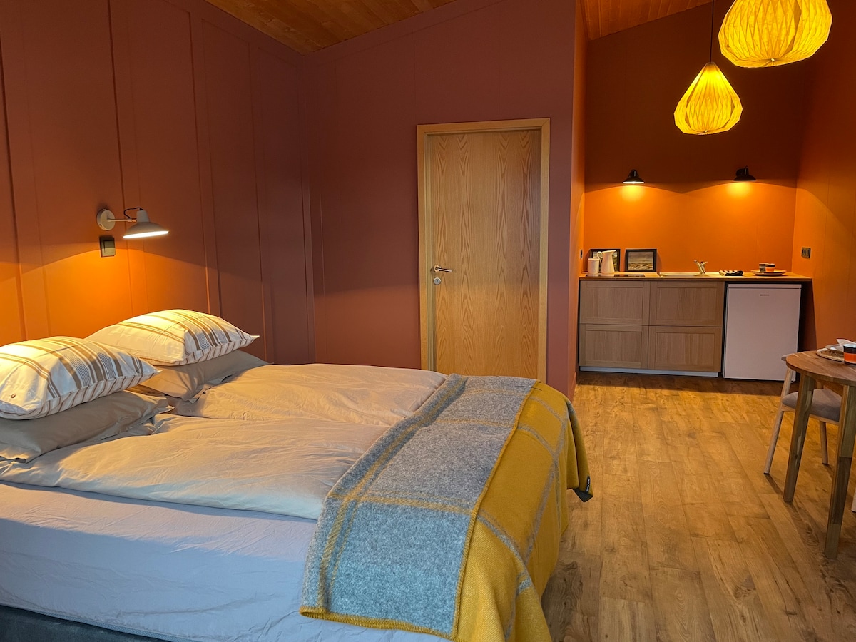 Landurlaub! Wenn Sie während Ihrer Reise nach Island etwas Einzigartiges erleben möchten, wurde dieses kleine Haus als Gästehaus umgestaltet. Auf unserem Bauernhof wurde es immer als Kalbhütte bezeichnet, da es in der Vergangenheit als kleine Scheune und Stall genutzt wurde. Auf der Außenseite bewahrten wir die alte Felslage und den Architekturstil, aber vermischten alte und neue Stile auf der Innenseite. Wir haben so viel Material wie möglich recycelt und wiederverwendet und sind mit dem Ergebnis zufrieden. Jetzt ist es eine gemütliche kleine Suite.