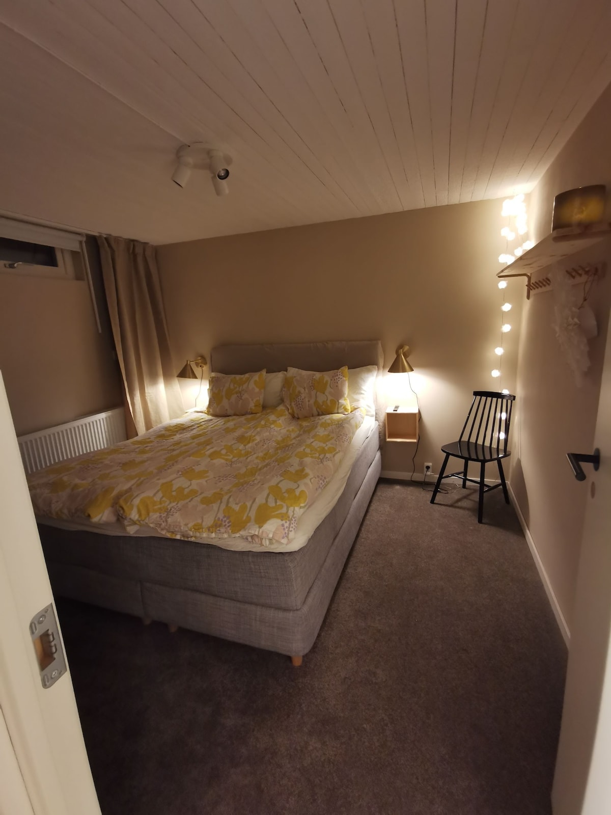 Apartment beautifully situated next to lake with bathing area and good fishing waters. Own entrance five steps down in single-family house. Two bedrooms, fully equipped kitchen with dining area, hall/desk area, shower and WC. TV with Chromecast. Free wifi, 1gb fiber connection. - Free parking - Regular wall routlet for engine heater/EV charge at cost price - About 100m to the bathing area - Free loan of bike, kayak and rowboat in summer - Easy check-in via a locked key cabinet - Self catering