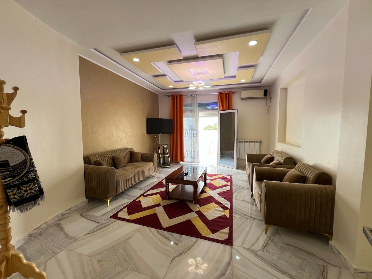 Geräumige 4-Zimmer-Wohnung, gut ausgestattet, im 3. und letzten Stock, 2 Terrassen mit atemberaubendem Blick, klimatisiert (2 Einheiten, die das gesamte Haus kühlen), Parkplatz für ein Auto in einem geschlossenen Innenhof am Haupteingang, in einer sehr ruhigen Gegend, mit völlig unabhängigem Zugang, 10 Minuten vom Stadtzentrum, 10 Minuten von Skikda Corniche.