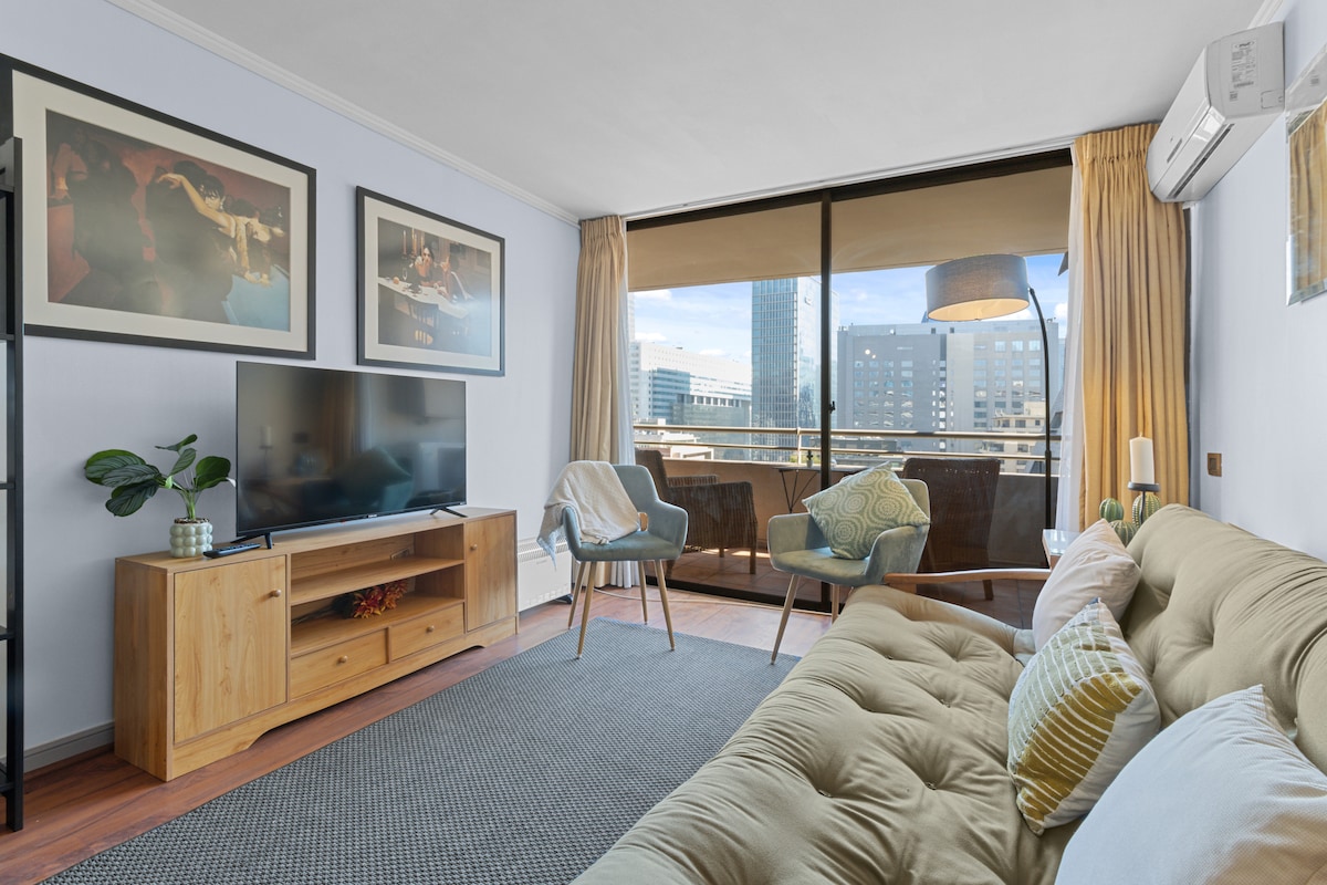 Elegante Wohnung im Herzen von Providencia. Mit einem atemberaubenden Blick auf die Anden und den legendären Cerro San Cristóbal. Nur wenige Schritte von der U-Bahn-Station Los Leones (Linie 1), dem städtischen Markt Tobalaba MUT und dem Costanera Center, dem größten Einkaufszentrum Chiles, entfernt. Umgeben von einer großen Auswahl an Restaurants und Bars. Ideal für kurze oder längere Aufenthalte, bieten wir Ihnen einen perfekten Rückzugsort, um Santiago zu erkunden oder sich nach einem anstrengenden Tag zu entspannen.