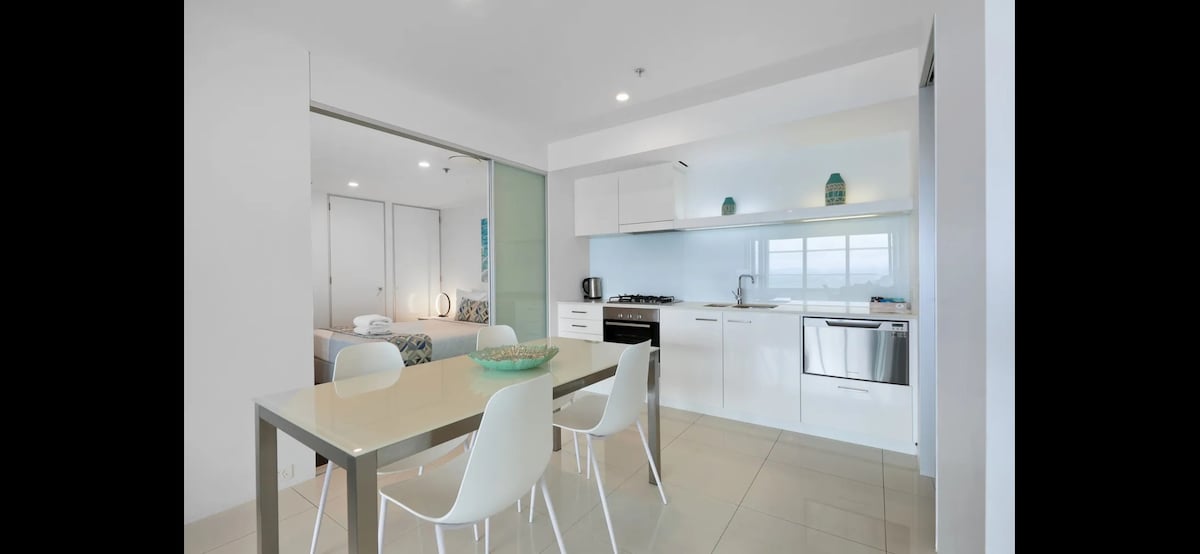 Ideale Lage für eine Familie oder eine Gruppe von Freunden (1 Kingsize-Bett und 2. Kingsize-Bett teilt sich in zwei Einzelbetten auf) & Baby willkommen. Nur wenige Gehminuten von den Geschäften/Restaurants der Cavil Ave entfernt und gegenüber von einem bewachten Strand! Du wirst dich wie zuhause fühlen und die Sonnenaufgänge/Sonnenuntergänge in dieser geräumigen 2-Zimmer-Wohnung mit 290-Grad-Blick bewundern. Neu renovierte Resort-Pools und Fitnessraum, Tennis- und Grillbereiche. Sicherer Park und Stadtbahnhof. Tennisschläger und Bogie-Boards auch! Einzigartig an diesem Ort ist, dass ich dich mit den Schlüsseln treffe.