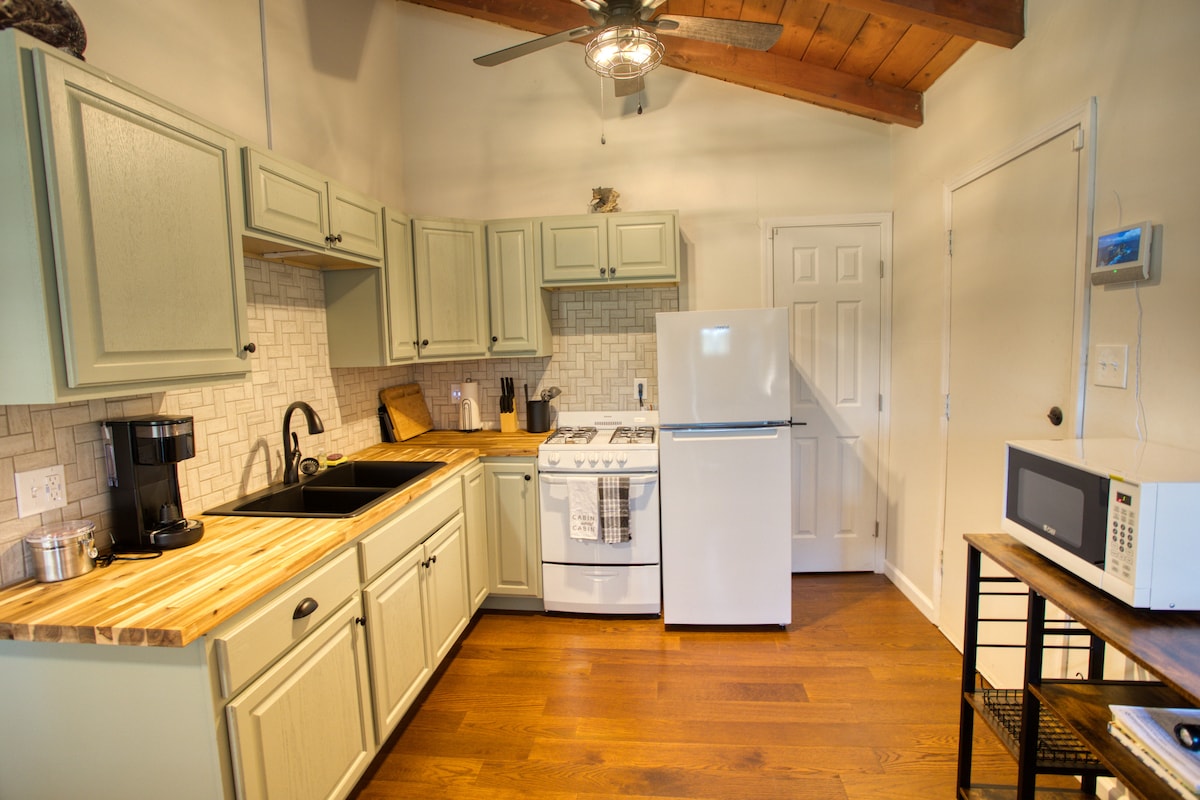 Welcome to The Bitty Bungalow, a charming tiny guest studio, perfect for those seeking cozy simplicity with all the comforts of home. It features a well-supplied mini kitchen, a deluxe redesigned bathroom, and a mini washer and dryer. My grandmother's antique roll-top desk and grandfather's original oil paintings complete the home's rustic look. While ideal for a solo or couple getaway, The Bitty Bungalow sleeps up to 6 guests, allowing families or groups to enjoy a modest retreat in the pines.
