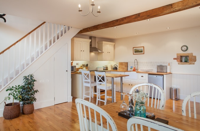 Eine helle und luftige Scheune mit zwei Schlafzimmern und sichtbaren Balken an der Seite unseres Familienhauses am Rande von Holcombe Village in Radstock. Mit Parkplätzen vor der Tür und auf einer Ebene mit verbreiterten Innentüren ist die Unterkunft für alle Fähigkeiten geeignet. Das erste von zwei Schlafzimmern verfügt über ein Doppelbett und das zweite über zwei Einzelbetten. Das Badezimmer verfügt über eine ebenerdige Dusche, Handtücher werden bereitgestellt. Offener Wohn-, Ess- und Küchenbereich und kleiner Terrassenbereich direkt vor der Terrassentür