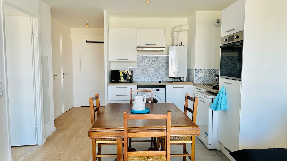 Ferienhaus mit 3 * möbliert. Charmante Wohnung mit Garage und Aufzug in einer neuen Residenz. Gut gelegen in der Nähe des Hafens, komfortabel und sehr hell. Komplette Ausstattung und Einrichtung am Meer. Eine abschließbare Fahrradgarage, die der Residenz gemeinsam ist, steht ebenfalls zur Verfügung. Bettwäsche und Handtücher werden zur Verfügung gestellt. 2 Fahrräder können kostenlos zur Verfügung gestellt werden.