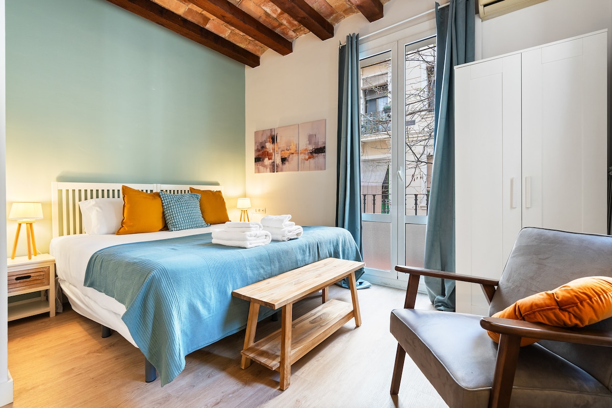 Hier bist du genau richtig, um eine unvergessliche Wohnung zu finden! Unser elegantes Zen-Studio ist von der visuellen Ästhetik Südostasiens inspiriert und basiert auf einer sehr interessanten Mischung aus edlen Materialien wie Bambus und Seide, was ihm eine ruhige und warme Atmosphäre verleiht. Die Essecke fängt die Sonne und das natürliche Licht ein und bietet einen spektakulären Blick auf Las Rambles. Und sei dir sicher, dass du keine zentraler gelegene Wohnung finden wirst!