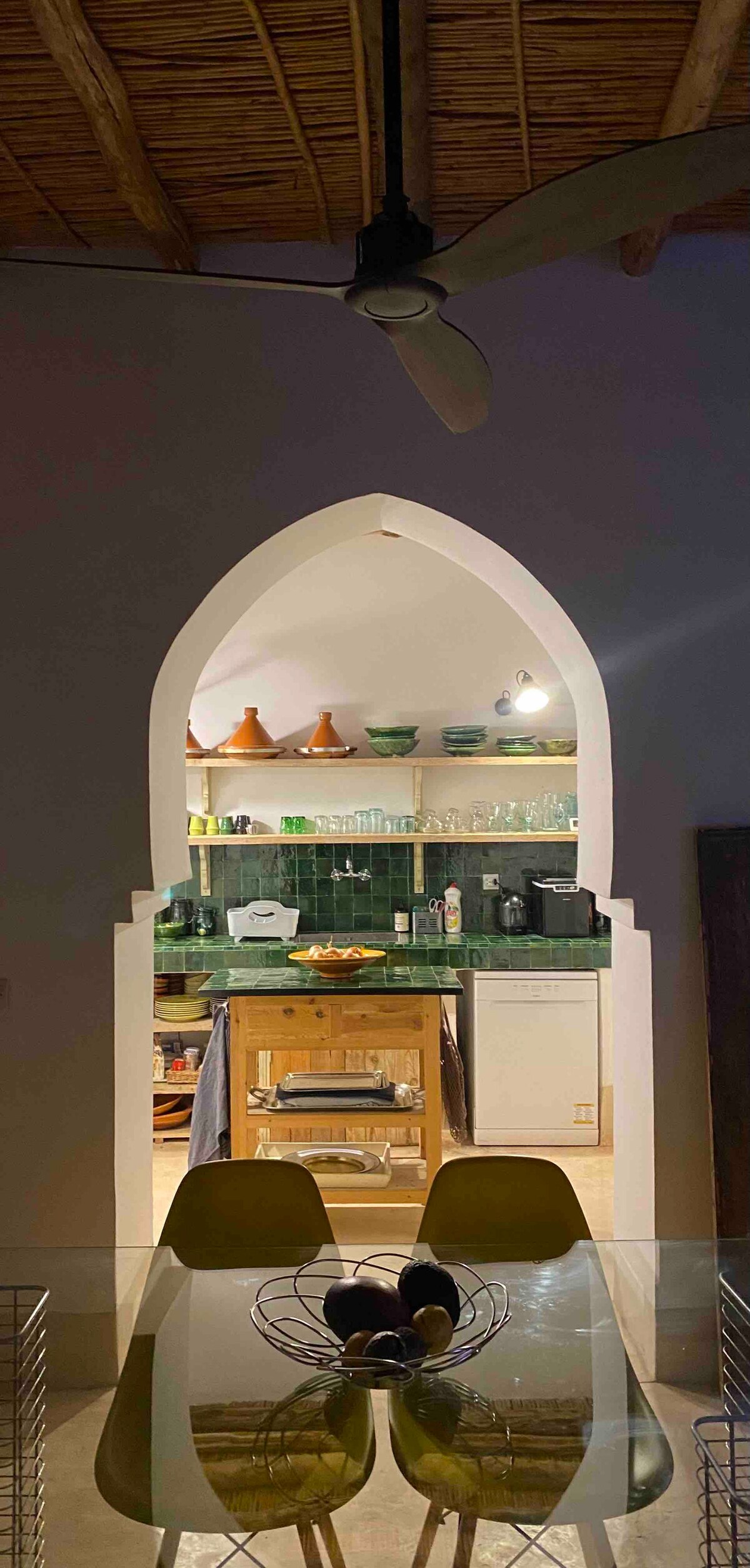 You enter a Berber-style house that blends traditional charm with modern comfort. The authentic architecture is distinguished by its high ceilings and large windows, allowing natural light to flood the space. Inside, everything has been designed with your comfort in mind: reversible air conditioning, Wi-Fi, and a refrigerator. Outside, a lush garden flourishes under the majestic gaze of the Atlas Mountains, creating a unique atmosphere where tradition and modernity come together in harmony.