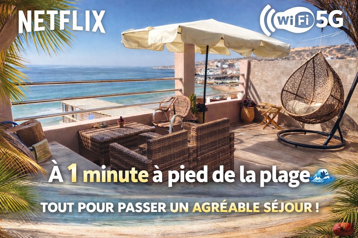 Entspannen Sie sich in dieser ruhigen, modernen Wohnung, nur 5 km vom Strand von Agadir entfernt. Mit Highspeed-WLAN, einem Smart-TV mit Netflix, einem eigenen Arbeitsplatz und einer voll ausgestatteten Küche ist es perfekt für Remote-Arbeit oder einen stilvollen Urlaub an der Küste.