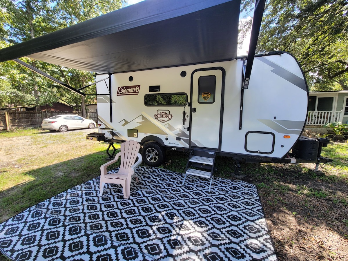 Bring Glamping in die Stadt, indem du bei uns übernachtest. Ein Hauch von glamourösem Camping, gemischt mit der Natur. Wohnmobil in North Charleston, in der Nähe der Innenstadt, des Flughafens, der Hauptattraktionen und der Alleen. Zentral gelegen und leicht zugänglich. Die Gegend entwickelt sich immer noch, aber du wirst die kurze Fahrt genießen, um Charleston und die Umgebung zu genießen. Wohnmobil geeignet für zwei Personen, mit einem Bett, Essbereich, Küche, Badezimmer, Terrasse und Parkplatz.