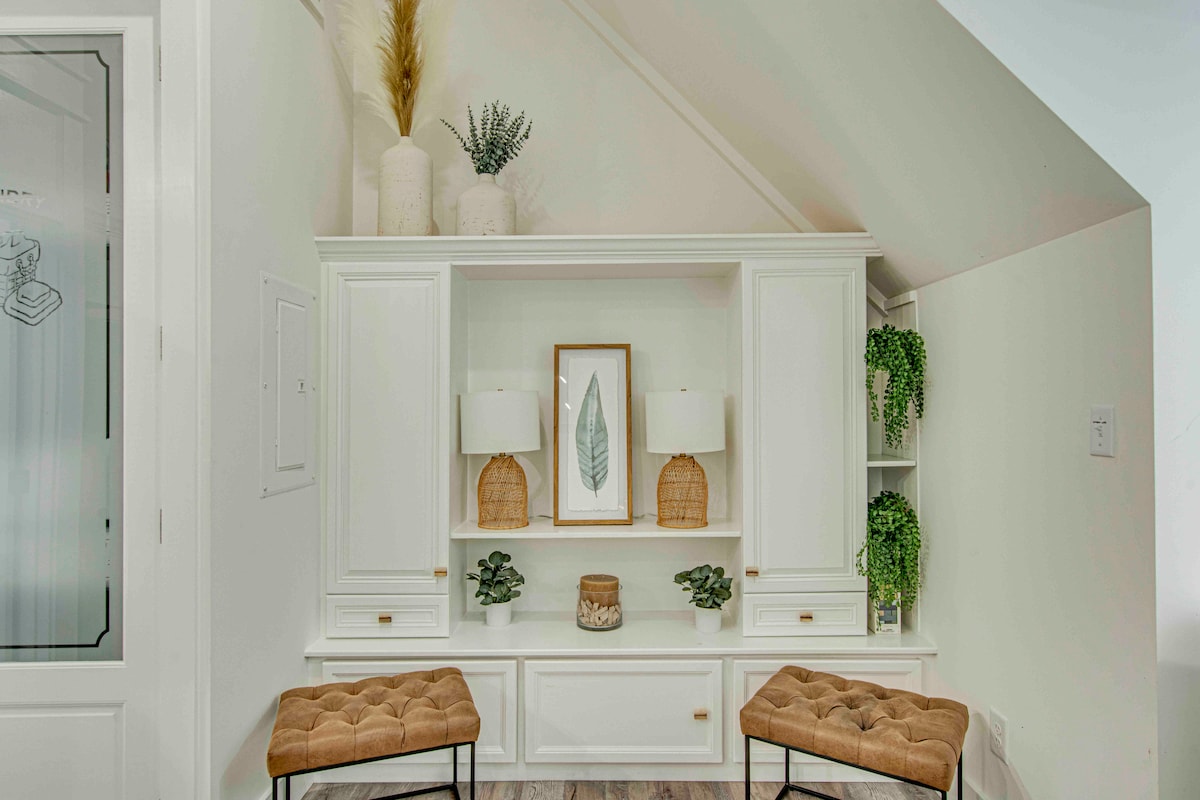 Unsere geräumige und abgeschiedene Gästesuite befindet sich in der perfekten Lage, um alles zu genießen, was das schöne Charleston zu bieten hat. Eingebettet in einen ruhigen Vorort sind wir weniger als zehn Fahrminuten von der Battery und dem historischen Viertel der Innenstadt und eine fünfzehnminütige Fahrt von Folly Beach entfernt. Die Suite wurde 2023 gebaut und verfügt über eine Vielzahl von Annehmlichkeiten für deine perfekte Reise. Mit schönen raumhohen Fenstern bietet die Aussicht einen Blick auf weitläufige Eichen und reife Magnolien, die die Kulisse für deinen Urlaub im Süden bilden.