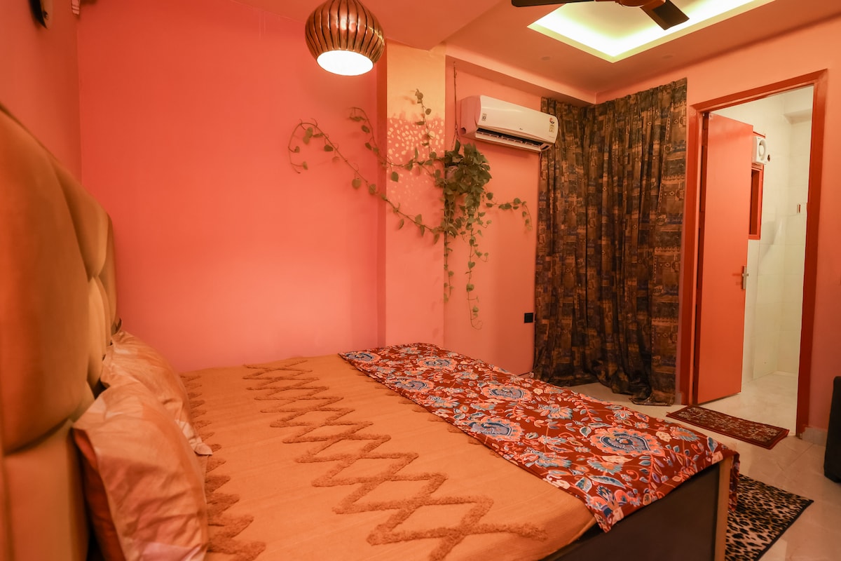 Dies ist eine 2-Zimmer-Wohnung mit eigener Terrasse, einem großen Wohnzimmer, Esszimmer und zwei angeschlossenen Badezimmern. Die Wohnung verfügt über eine gut ausgestattete Küche. Sie ist sehr geschmackvoll mit allen modernen Annehmlichkeiten und mit viel Liebe und Kreativität in diesem schönen Viertel von Hauz Khas Village eingerichtet.