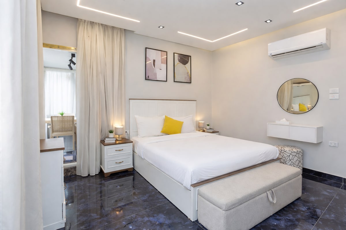 this stylish room is located at the heart of Downtown Cairo, 500 meter away from the iconic Tahrir square . the room is an 3 min walk from the Egyptian Museum and is surrounded with all kinds of restaurants and cafes. the room features as a comfortable queen size bed , smart TV, AC, Wi-Fi, Mini bar , private cozy bathroom, and shared loaded kitchen. also we provide free breakfast .