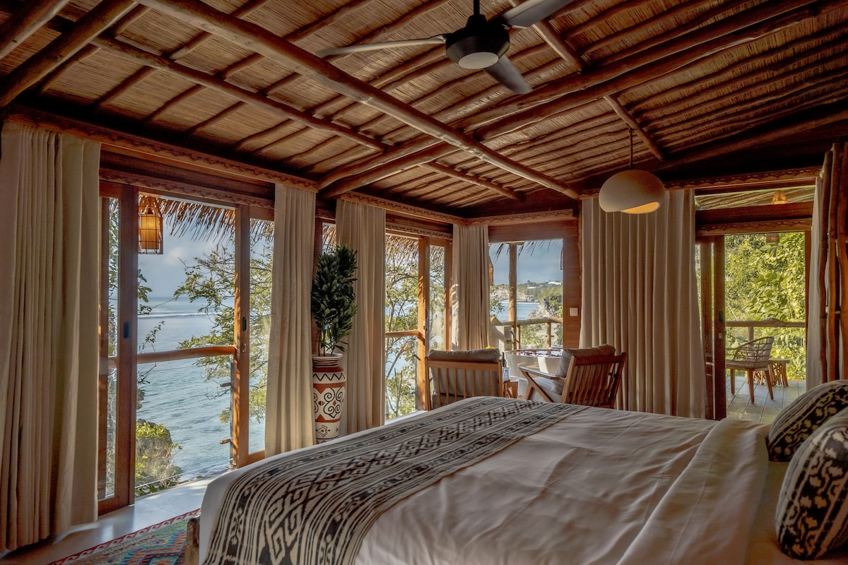 Wache mit dem Rauschen der Wellen auf und genieße den atemberaubenden Meerblick direkt von deinem Bett aus. Dieses Anwesen ist künstlerisch mit einem tropischen Baumhaus-Konzept gestaltet, das sich in einem erd-inspirierten sanften Ton verbindet, der eine einladende und ruhige Umgebung schafft und gleichzeitig die natürlichen Elemente des Dschungels und des Ozeans genießt. Es bietet tropische Hüttenbungalows und ein Restaurant auf dem Gelände, und du kannst unsere tropische Hütte eher wie ein Zufluchtsort finden, der ausschließlich für dich reserviert ist.