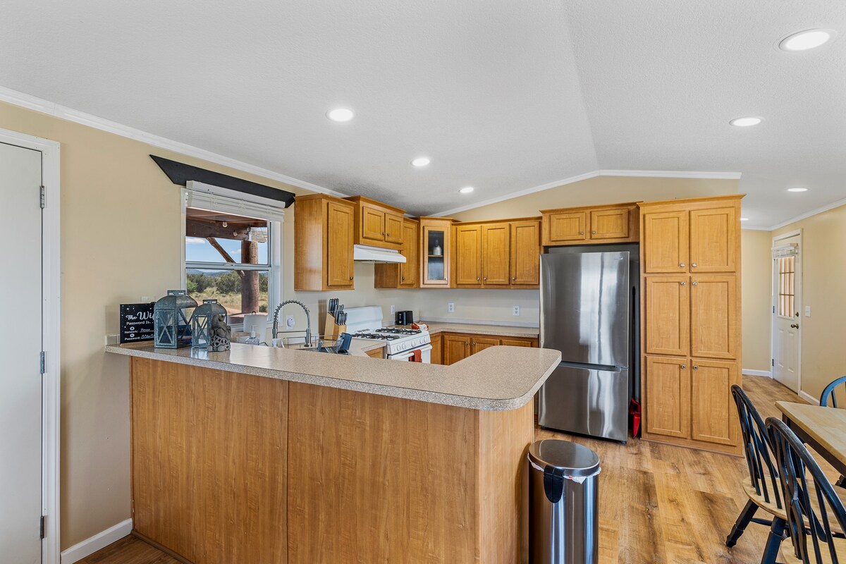 Willkommen in deinem neuen Zuhause - 20 Minuten vom Grand Canyon South Rim entfernt und auf 12 Hektar privater, ruhiger und wunderschöner Natur mit freiem Blick auf die nahe gelegenen Berge und die Sterne. Unser 529 Quadratfuß großes Tiny House mit 2 Schlafzimmern und 1 Bad * Neubau * ist haustierfreundlich und verfügt über eine voll ausgestattete Küche, einen Balkon mit Blick auf die Wüstenlandschaft, schnelles Internet (Starlink), eine Außenterrasse, große Waschmaschinen und alle luxuriösen Annehmlichkeiten eines modernen Hauses.