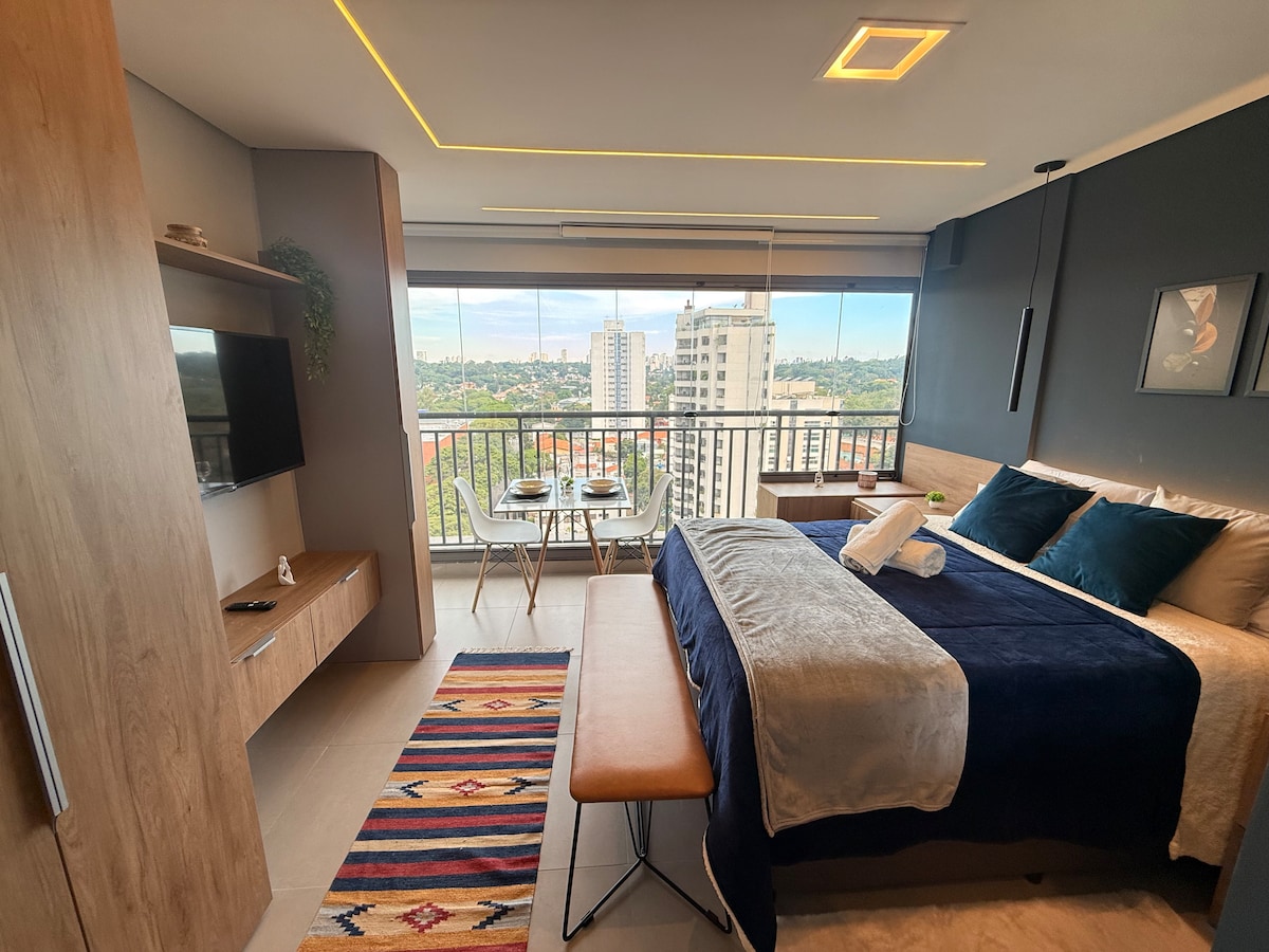 Entspannen Sie sich in diesem ruhigen, stilvollen, charmanten und gemütlichen Raum. Sehr komfortables Queensize-Bett, Smart-TV 50", Klimaanlage, voll ausgestattete Küche. Hängesessel mit einer schönen Aussicht auf São Paulo. Ideal für ein Paar, bietet Platz für 4 Personen (2 auf Schlafsofa). Haustierfreundlich! Rezeption, Self-Check-in, Pool, Fitnessraum und OMO-Wäscherei. Minimarkt. Parkplatz vor Ort. Viertel Campo Belo, 5 Minuten vom Flughafen Congonhas, Region mit voller Infrastruktur von Restaurants, Handel und Dienstleistungen.