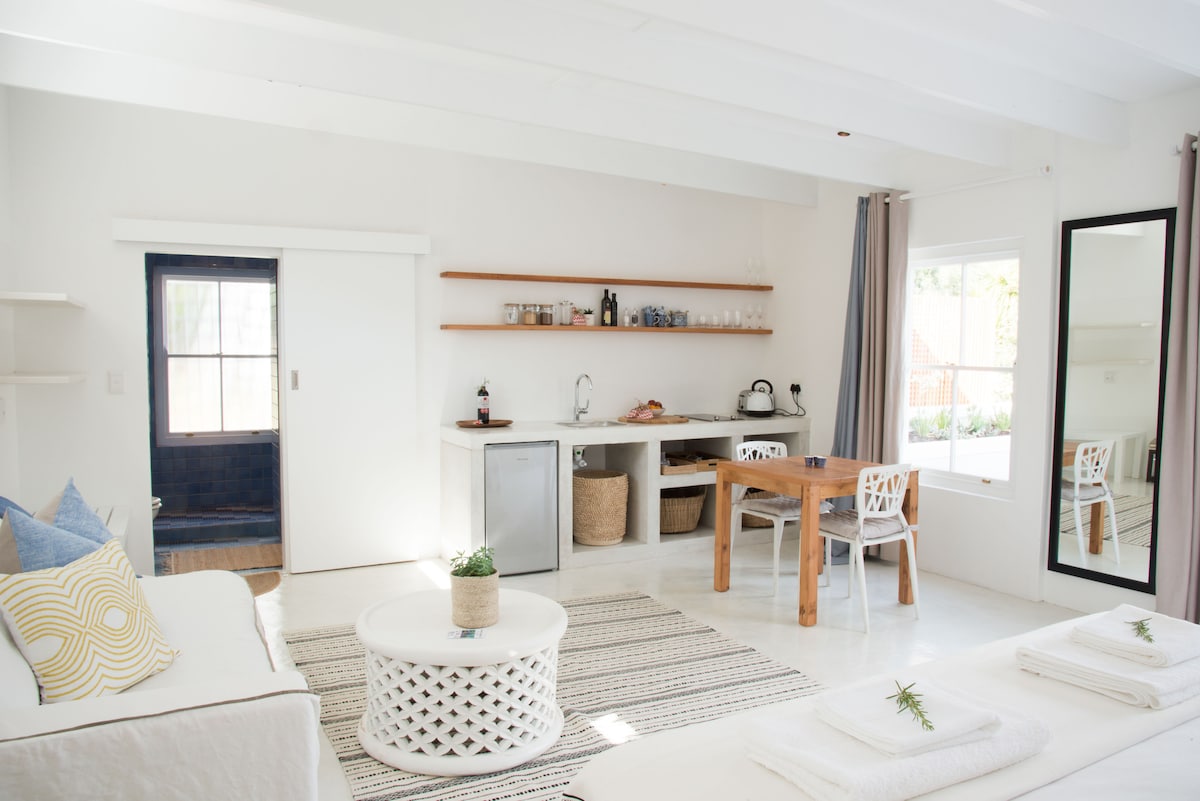 An ideal escape, our Studio is a private, self-catering garden unit located on the mountainside on a 300 Ha farm , with a pool (shared), & beaches closeby (15 min). Off the Grid - own power supply & fresh spring water extracted high in the mountains. Panoramic views over sea and mountain landscapes , surrounded by fynbos and wild birdlife , close to Capetown (55 km), airport, (40km) shopping amenities (7km) . Unwind after a busy day and relax at your private boma or around the pool.