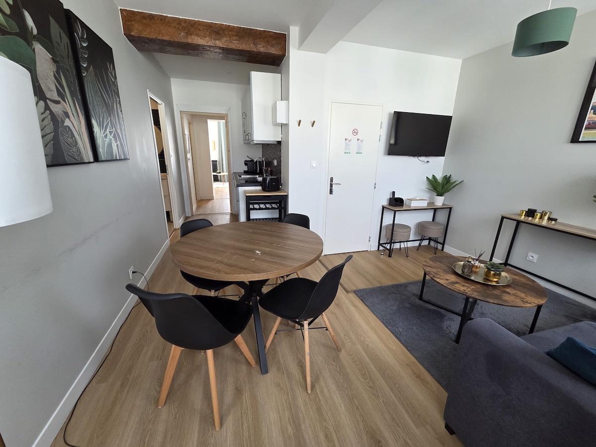 🌿 Charming 1-Bedroom Apartment 🍀 With free parking ✅️ ➡️ Located in an old building in the heart of the Madeleine district in ⚜️ Angoulême ⚜️ Train Station 🚆 : 🚶7 min City Center: 🚶♂️12 min All shops/public transport: 🚶🏽♀️2 min 😴 Bedroom - Queen-size bed & 🔅Lighting 🔆 adjustable via remote control ⚙️ 💤 Sofa bed 🛜 Very high-speed Wi-Fi 📺 55" Smart TV 🎧 Home cinema 🍿🎥 NETFLIX 🍺| ⛱️Terrace (🔜 Summer 2026) Adding 10€/person/day if booking for 2 with 2 beds