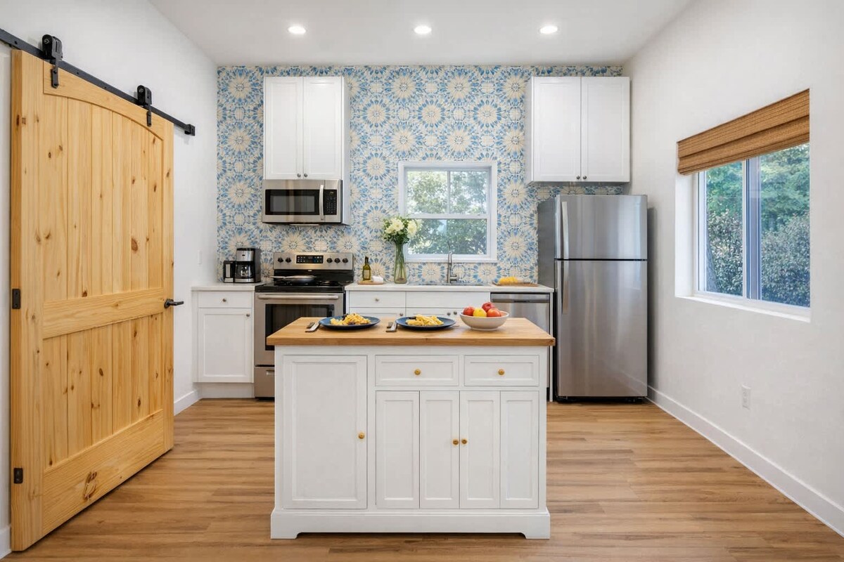 Betrete das 6 Hektar große Grundstück durch den abgeschlossenen Eingang, über die Bachbrücke, zum Gästehaus, genieße Annehmlichkeiten wie Internet mit WLAN, Tesla-EV-Ladegerät, vorderer Terrassenbereich mit Sitzgelegenheiten und Grill, überdachter Pavillonbereich mit Sitzgelegenheiten, Feuerstelle und TV mit Blick auf kleinen Bach, haustierfreundlich eingezäunter Bereich, das Innere des Gästehauses ist warm und einladend mit 12' hoher Wohnzimmerdecke mit vielen Fenstern für dieses offene Gefühl, voll ausgestatteter Küchenbereich, stapelbarer Waschmaschine und Trockner, 2 individuellen Schlafzimmern und 1 voll ausgestattetem Badezimmer.