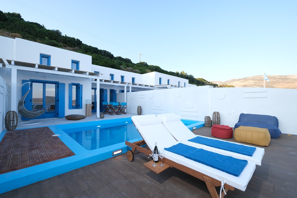 Aelia Collection Suites -Adults Friendly is consisted of 5 sustainable, fully equipped houses, with a great view at the Aegean Sea. Each one has its own private swimming pool, with sea water and its own jacuzzi. Each suite can accomodate upto 3-4 persons. It is located 1.5 km from the main port. The beach is located at 50 meters.