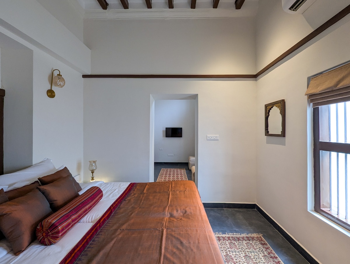 A peaceful retreat, the Govinda Suite was once the owners’ grandfather's study. The room has paintings of Kali adorned on a wall. It features a lounge space with a TV and seating, and a bedroom tucked away inside. The room soaks in sunlight during sunset, and the bathroom walls have a warm and bright yellow oxidized finish, creating a cozy atmosphere. BREAKFAST is included in the stay.