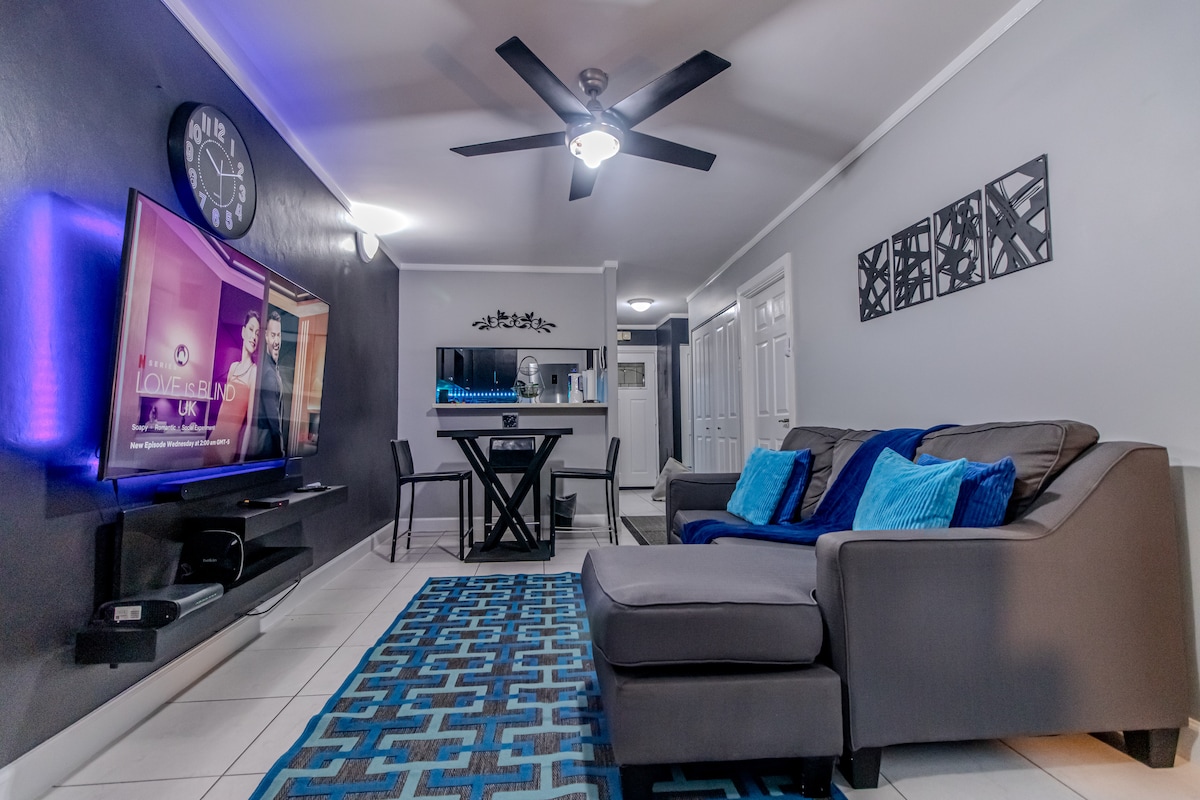 Betreten Sie eine frisch renovierte Designerwohnung, in der moderner Stil auf intelligente Technologie trifft. Mit eleganten schwarz-grauen Innenräumen, lebhaften LED-Akzenten und Smart-Home-Funktionen ist dieser sehr zentral gelegene Rückzugsort nur wenige Minuten von New Kingston, Half-Way Tree, Restaurants, Einkaufsmöglichkeiten und Nachtleben entfernt. Perfekt für Geschäftsreisende, Urlauber oder Paare, die Komfort mit einem gewagten Touch suchen.