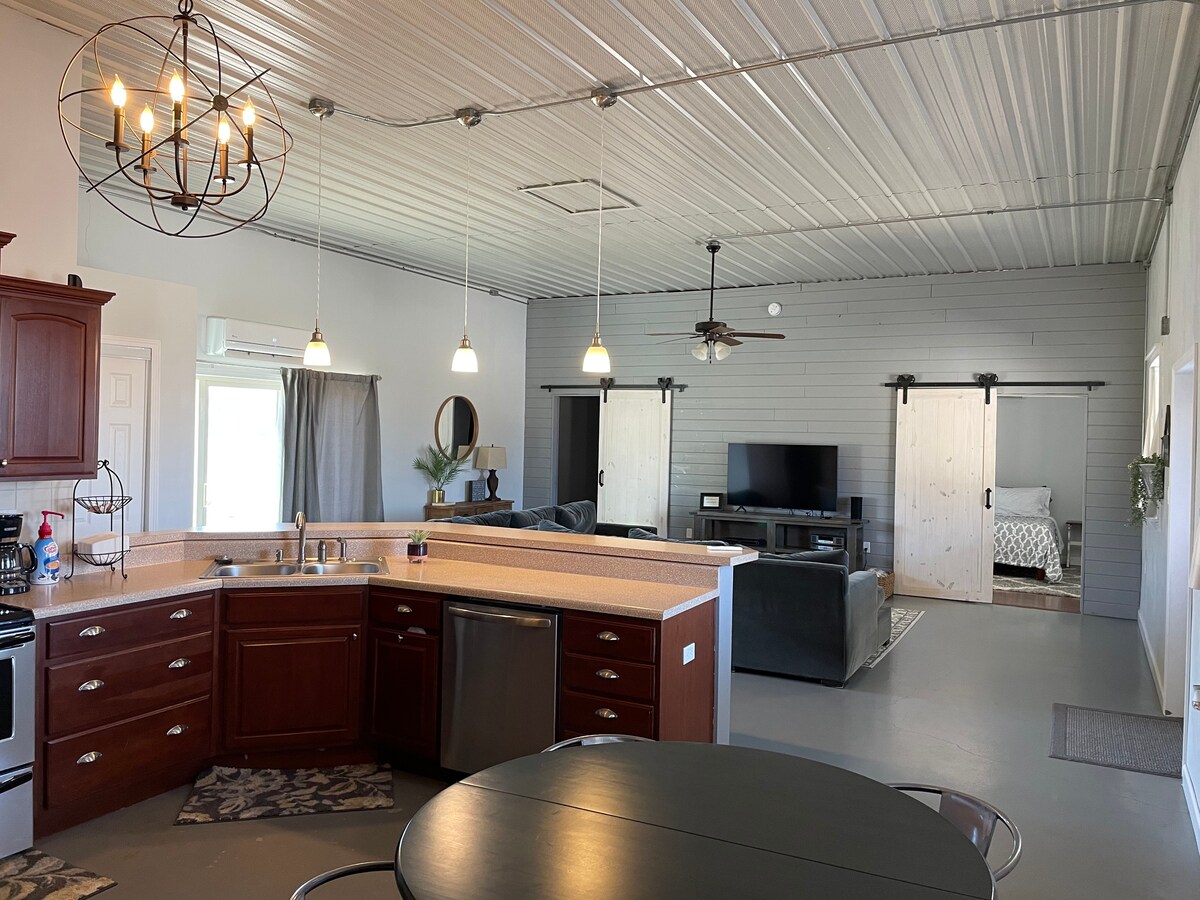 Enjoy a family- and pet-friendly stay in this beautifully remodeled barndominium just 5 minutes from downtown Millstadt and 20 minutes from downtown St. Louis. This charming retreat blends modern comfort with history, set in a restored barn that once served as an honor-system farm stand. Perfect for families, it offers 2 bedrooms (King bed and single-over-double bunk), a fully equipped kitchen, open living area, 55” TV, and fast internet. See more below