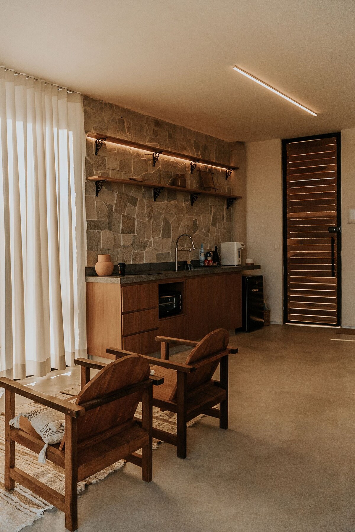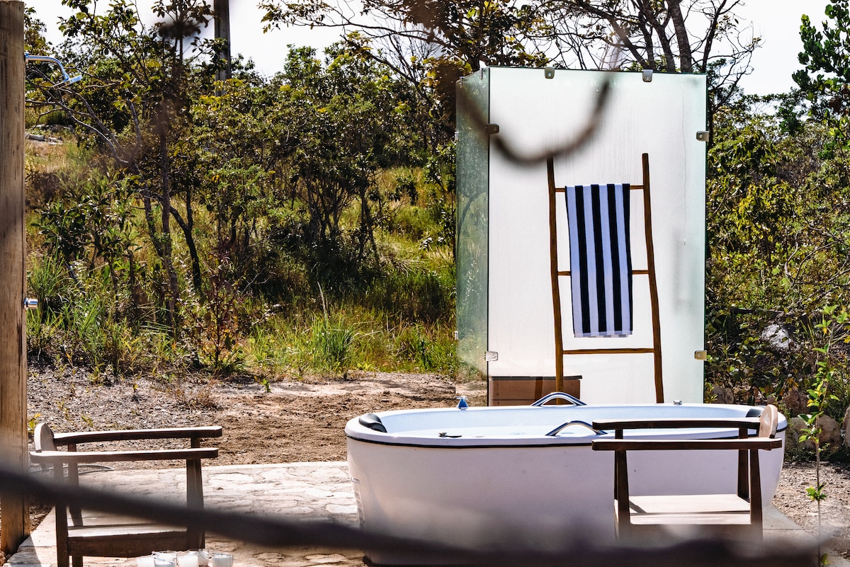 Inaê ist ein Bad in Komfort und brasilianischer Seele. Mit 80 m² purer Inspiration verbindet es autoritäre Architektur mit einer Aussicht, die sich wie ein lebendiges Bild öffnet. Hochwertige Bettwäsche für maximalen Komfort. Voll ausgestattete Küche und Badewanne, aber das wahre Highlight ist unser natürlicher Pool mit ozonisiertem Wasser, eine schöne Terrasse, eine Sauna und ein kleines kostenloses Frühstück, das von unserem Küchenchef zubereitet wird. Ideal für diejenigen, die ein immersives Erlebnis im einheimischen Cerrado mit Komfort suchen.