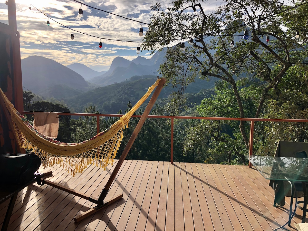 Gemütliches Ferienhaus in einer ländlichen Wohnanlage mit atemberaubendem Blick: Ein Meer von Bergen, über dem sich der blaue Himmel erstreckt. Hier kannst du die friedlichsten Sonnenaufgänge sehen und die atemberaubendsten Sonnenuntergänge genießen! All dies inmitten von viel Grün, umgeben von Stille und überflutet von Vögeln! Gesegneter und perfekter Ort für Momente für zwei und Familien, um sich an der Feuerstelle zu versammeln, Picknicks zu genießen, die die Natur betrachten!