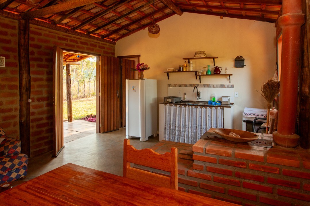 Dieses schöne, super komfortable Bio-Chalet bietet Platz für 01 Paar. Es liegt inmitten der unglaublichen Natur von Tijucal, einem ländlichen Gebiet von Conceição do Mato Dentro, und ist ideal für Paare, die einen Wein am Holzofen trinken und ein erfrischendes Bad in den Wasserfällen auf dem Grundstück genießen möchten. Den Gästen stehen auch saisonale Früchte, Bio-Gemüse und Eier von freilaufenden Hühnern zur Verfügung Der natürliche Pool und der Wasserfall werden von den Gästen der beiden verfügbaren Häuser gemeinsam genutzt.