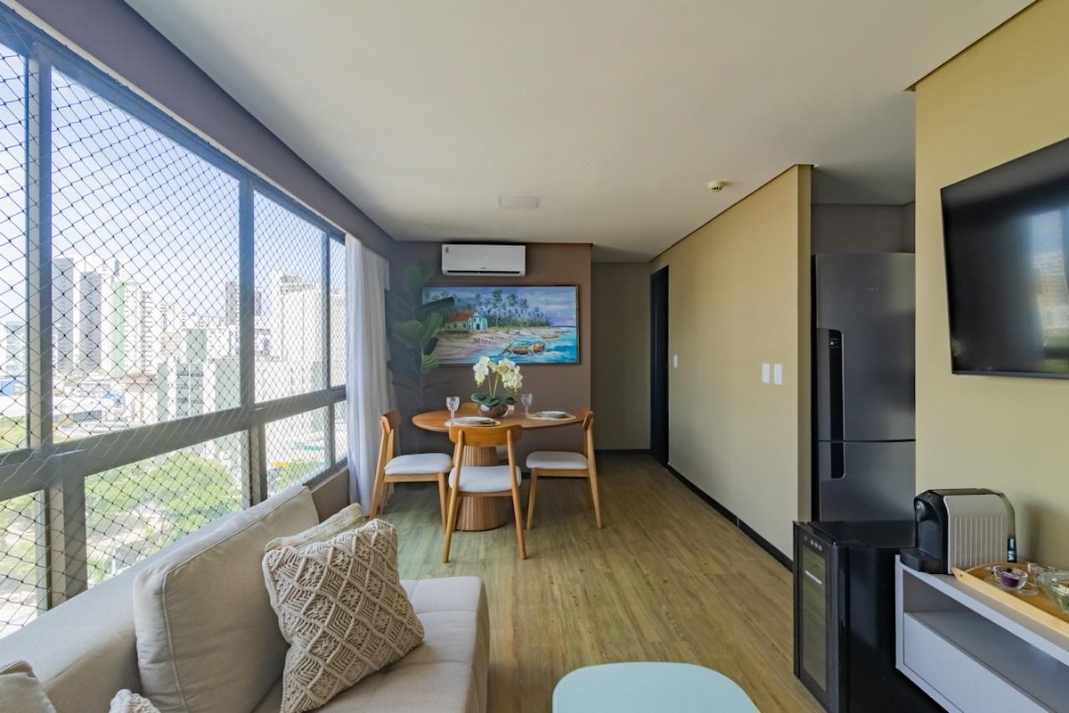 Flat espaçoso e mobiliado, uma excelente localização a 350 metros da praia de Viagem, com Split no quarto e na sala. A poucos metros da praia, 7 min do aeroporto, próximo à 3 shoppings centers, supermercados, postos, farmácias, opções de alimentação/laser/diversão. Possui um terraço maravilhoso na cobertura, com piscina e área de relax com vista do Recife e do Mar, além de uma academia toda equipada. O novo restaurante do hotel está servindo café da manhã e almoço. Estacionamento rotativo.