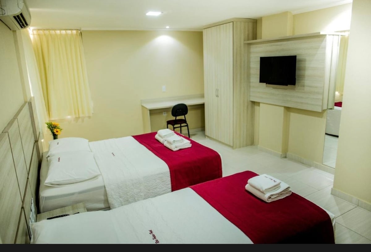 Em frente à uma praça com pizzarias, lojas, restaurantes e clínicas. No coração da cidade. Quarto suíte com frigobar, chuveiro elétrico, mesa com cadeiras, ac, circuito de câmeras.
