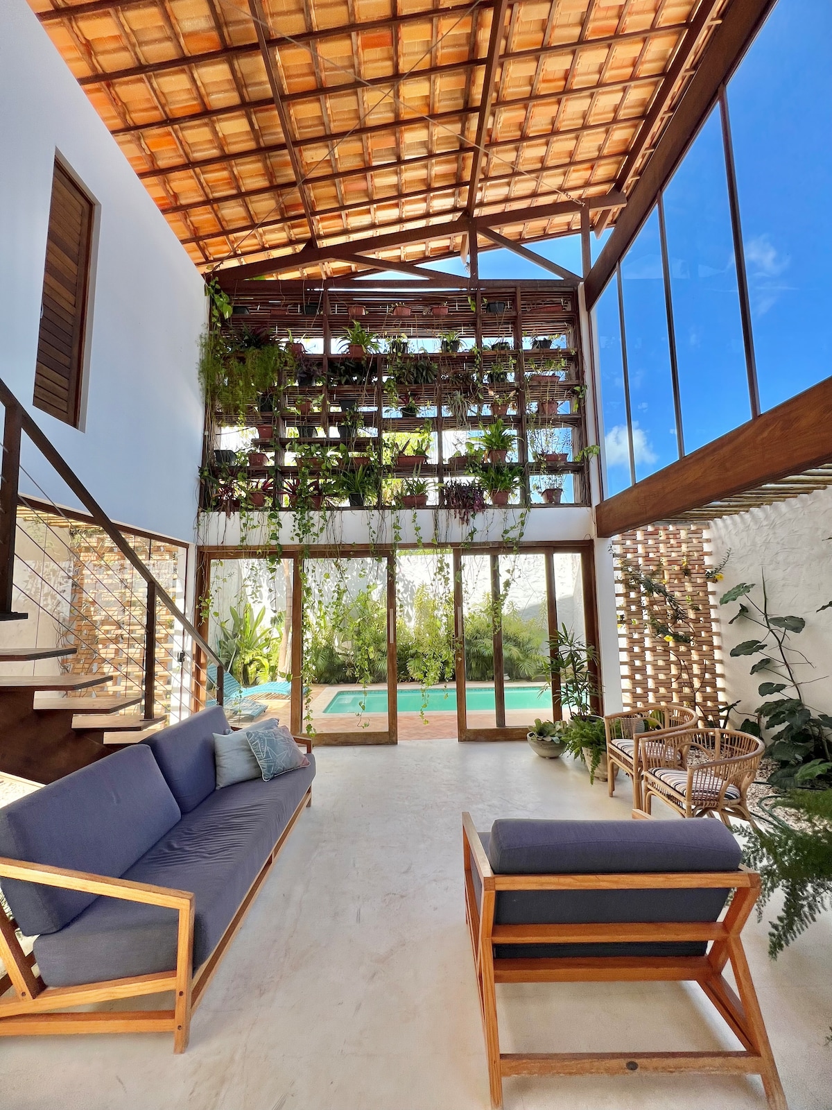 A Casa Céu reúne elegância, conforto e leveza em ambientes amplos, iluminados e naturalmente ventilados. A suíte oferece cama queen-size, ar-condicionado, closet, banheiro com chuveiro quente e um espaço exclusivo para trabalho. A cozinha espaçosa integra-se harmoniosamente a casa e a sala de jantar à noite ganha um clima romântico. O grande destaque é a área externa, com uma banheira rodeada por um lindo jardim perfeita para relaxar e se conectar profundamente com a natureza.