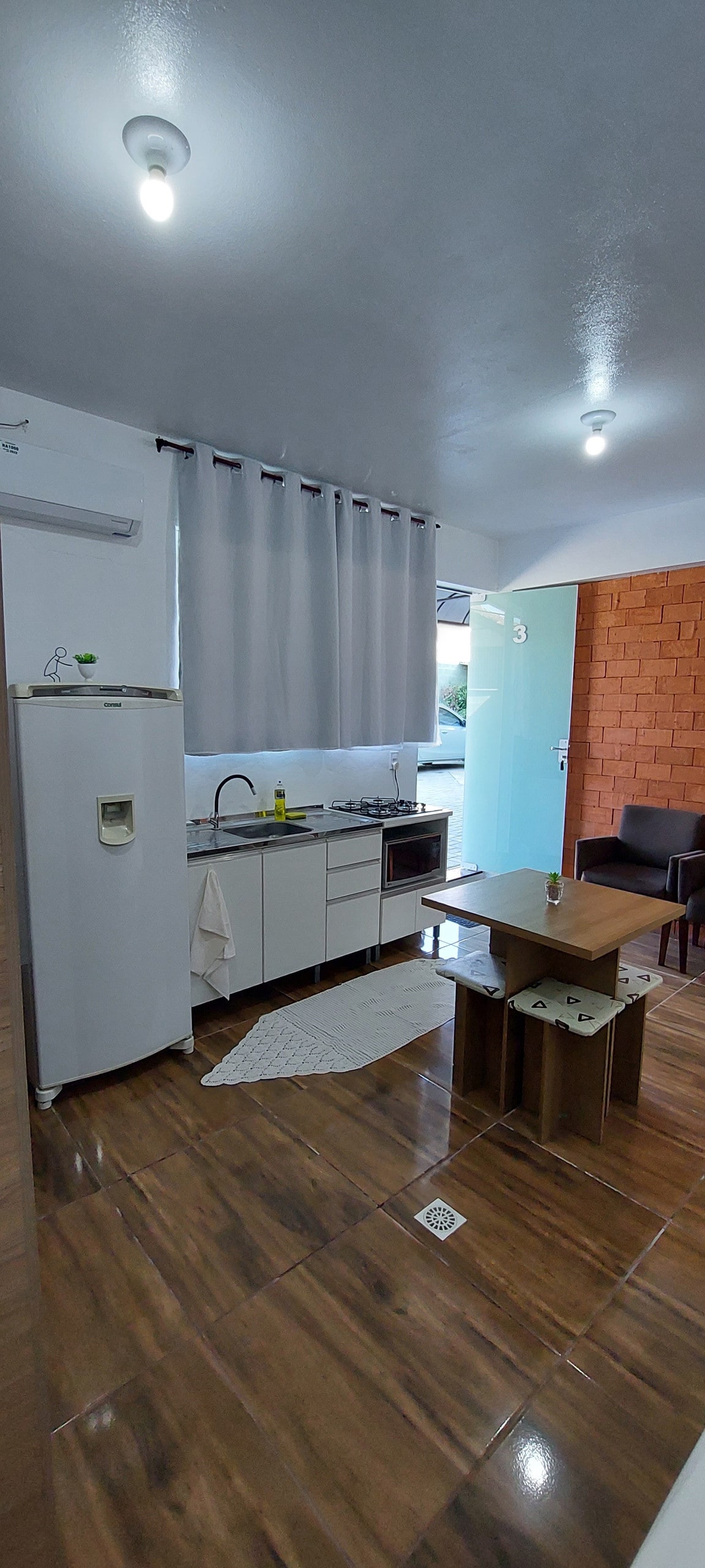 Espaço inteiro com ar, cozinha e garagem coberta.