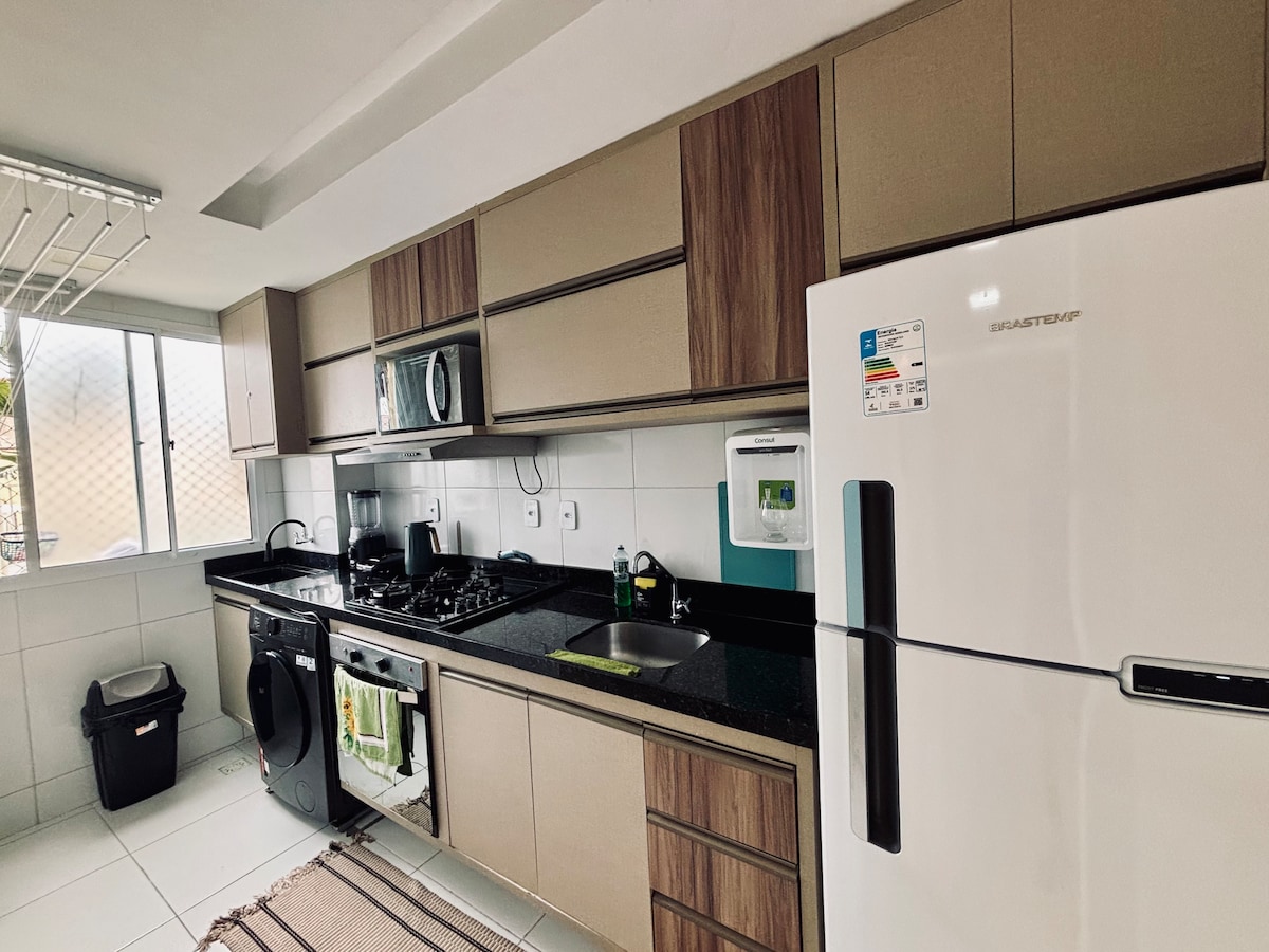 Ganze Wohnung nur für dich! im Raum haben wir: 1 voll ausgestattete Küche 1 Wohn- und Esszimmer 1 Gourmet-Balkon 2 Schlafzimmer, beide klimatisiert und mit Ventilator 2 Einzelmatratzen für die 2 1 Swimmingpool 1 Spielplatz OBS: Wir haben 6 Personen in der Unterkunft untergebracht, 3 in einem Zimmer und 3 im anderen, wobei zu beachten ist, dass die 2 Personen auf der zusätzlichen Einzelmatratze (1 Matratze für jede) liegen werden, die Aufteilung liegt in deinem Ermessen. In unserem Raum bist du frei... ah, du kannst auf mehr als 6 Personen erweitern...