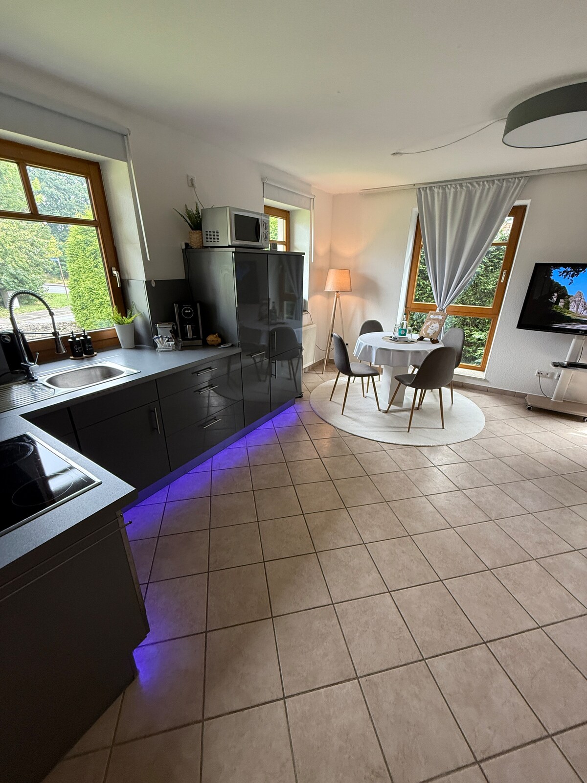 Das Apartment im ehemaligen Kuhstall besteht aus aus einem 40qm großen Raum inklusive Miniküche, separatem Dusch-WC. Es ist aufgrund der 3 bodentiefen, nach Süden ausgerichteten Fenster angenehm hell und durch die Fußbodenheizung herrlich fußwarm. Das Bad verfügt über eine ebenerdige Dusche, einen Handtuchtrockner, ein großes Waschbecken und ein WC. Die Küche ist mit einem 2-PLatten-Kochfeld, Spüle und Kühlschrank ausgestattet. Geschirr, Besteck und Töpfe stehen für 2 Personen zur Verfügung.