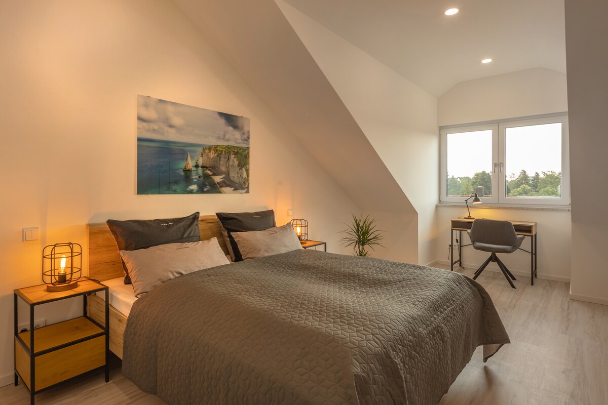 Herzlich Willkommen in einer unserer Neubau-Ferienwohnungen, die mit hochwertigen Einrichtungen erfreut. Vom Eingangsbereich rechts das Schlafzimmer und links das Bad. Im Anschluß großzügiger und heller Wohn - und Küchenbereich. Ausziehcouch, Ohrensessel,Beistelltisch. Großer Esstisch mit Polsterstühlen Komplett ausgestattete Küchen Balkone mit Tisch und Stühlen 2 Stück Multimedia Fernseher (Wohnzimmer + Schlafzimmer) Kleiderschrank und Kommode, Boxspringbett WLAN inklusive