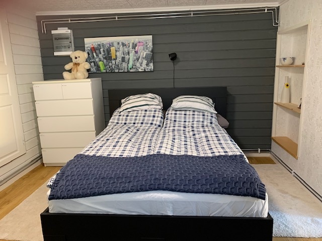 1-bedroom apartment with your own private entrance, small outdoor area and parking right outside the door. You get everything you need for your stay in a fully furnished apartment. Bed linens & towels included. TV (chromecast) is added recently. It is located in a quiet villa area, close to a lake and forest. Easy access to public transport, bus stop is just a few hundred meters away, it takes approx 20-30 min to the city. Easy connection to Arlanda airport. Self-check in.