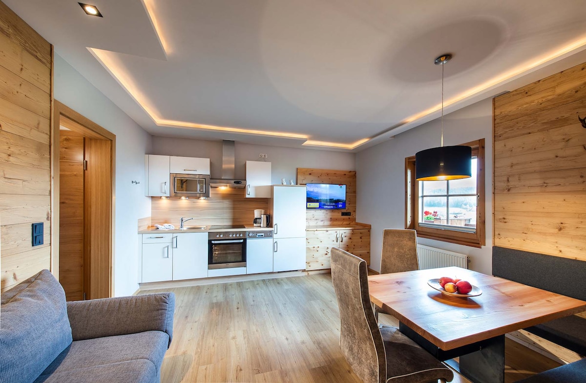 Auf ca. 45 m² Wohnfläche urlauben Sie in einem großen Zirbenschlafzimmer mit Vollholzausstattung, einer ausziehbaren Schlafcouch für 2 Personen, Wohnraum mit Kochnische, Essecke und Sitzcouch, Bad, WC, Haarföhn, Sat-TV, Telefon und freiem Internetzugang. Die hellen und einladenden Räumlichkeiten vermitteln eine gemütliche Atmosphäre. Lassen Sie sich vom Panoramaausblick von Ihrem Balkon aus verzaubern.