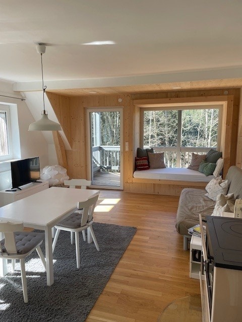 Ferienwohnung im Nebengebäude auf 2 Etagen. Eigener Eingang, Vorraum mit Garderobe und Sauna. Offenes Dachgeschoss mit Küche, Wohn- und Essbereich. In einer Nische ist ein Doppelbett(im Wohnraum) Chillen, Kamin, Fernseher! Terrasse: Sitzgruppe, Sonnenschirm, Gasgrill und Ausblick. +Schlafzimmer - Doppelbett, auf Wunsch Kinderbett. Badezimmer, Badewanne u. Dusche. Badeplatz 20m am Fluss - wenn der Wasserstand es zulässt. Loipe am Haus 15min Skigebiet, 5 See Wandern