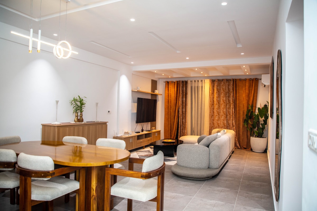 Willkommen in der Résidence HAYMES, Eine Wohnung, die zeitgenössische Eleganz, afrikanische Akzente und High-End vereint. Im Herzen des ruhigen Viertels Mockeyville gelegen, bietet Ihnen dieser Kokon mit einem Schlafzimmer die Intimität eines Zuhauses und die Raffinesse eines Ortes, der zum Entspannen gedacht ist. Stil & Ambiente Afro-minimalistische Dekoration, klare Linien, natürliche Materialien, Kunstgegenstände und Möbel, die gesucht werden, um die warmen Tage und die sanften Bassamois-Abende zu genießen...