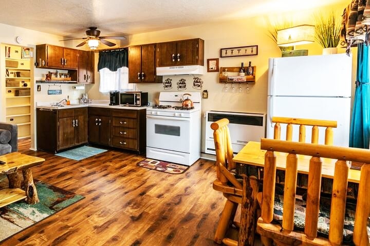 Schöne, entspannende Hütte mit zwei Schlafzimmern im Wald. Genieße den Kamin, während du fernsiehst oder liest. Möchtest du den Körper nach einem Tag Mountainbiken oder Skifahren beruhigen? Genieße den Whirlpool und die Terrasse, die von hoch aufragenden Kiefern umgeben sind. Möchtest du kochen? Bereite deine Lieblingsmahlzeiten in der Küche oder auf dem Grill zu. Wir haben letzten Sommer auch einen coolen Terrassen-Treffbereich hinzugefügt, ein sehr entspannender und angenehmer Ort. Und ein eingezäunter Hof für Hunde! Haustiere sind gegen eine zusätzliche Reinigungsgebühr erlaubt. Check-out-Zeit 11:00 Uhr. Check-in 16:00 Uhr.