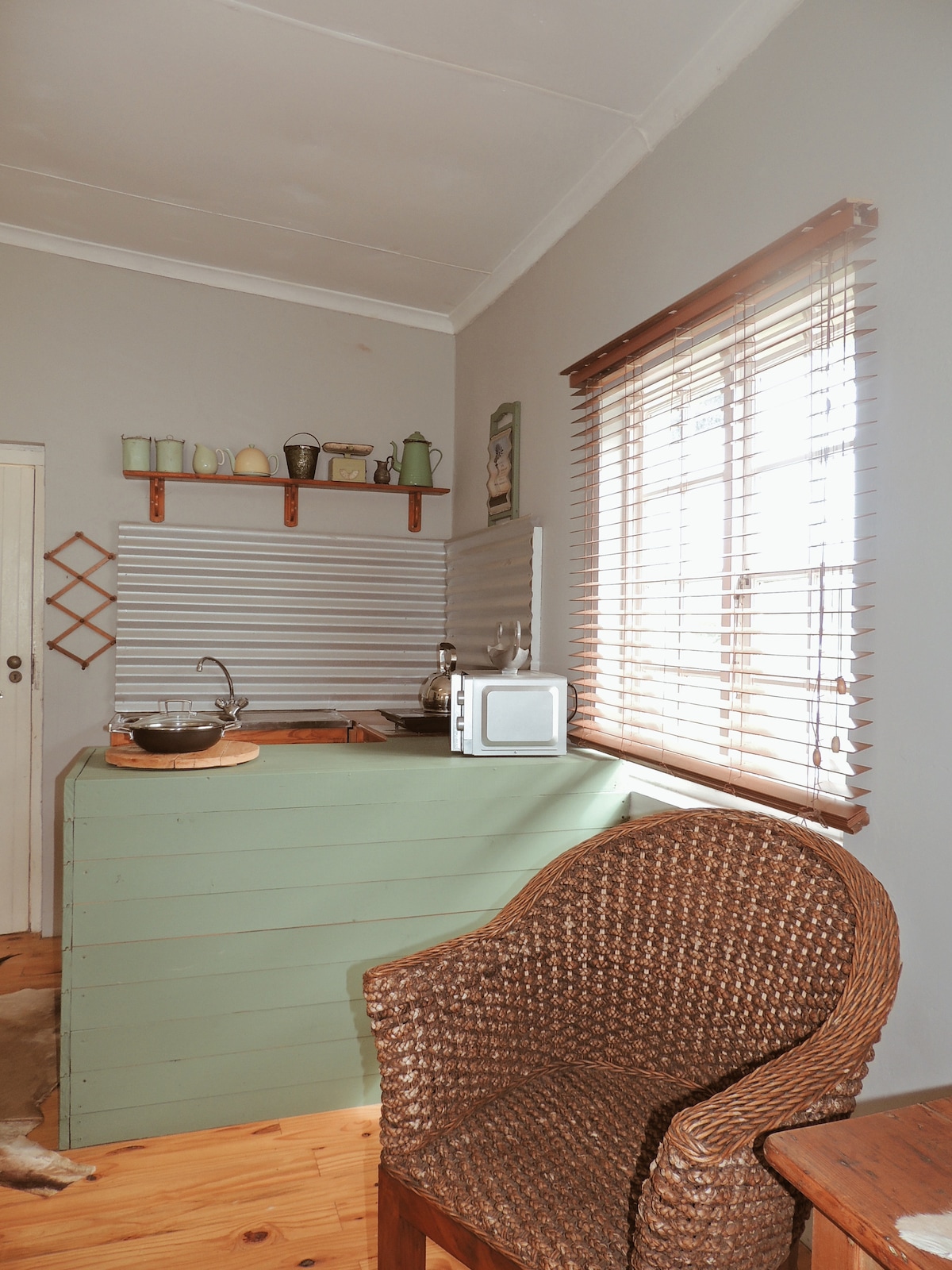 Dieses gemütliche, offene Ferienhaus verfügt über ein Doppelbett und ein eigenes Bad mit einer Dusche. Die Unterkunft verfügt über eine Küchenzeile mit einer Induktionsplatte und einen kleinen Esstisch mit Sitzgelegenheiten. Draußen gibt es einen Boma Braai/Grill mit Berg- und Gartenblick.