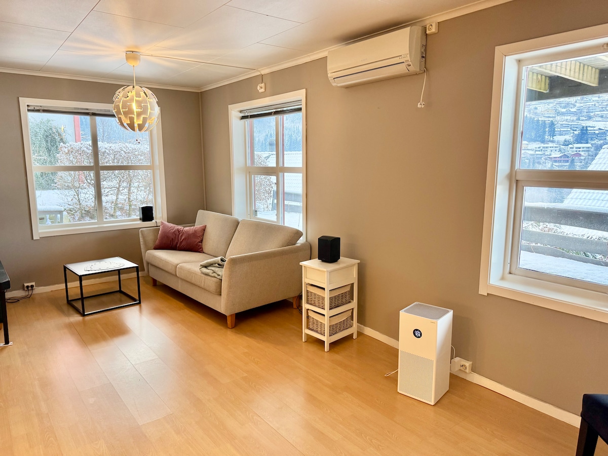 Ruhige Wohnung mit Aussicht - nur wenige Gehminuten vom Krankenhaus, Lebensmittelgeschäft und Sand-Volleyballplatz entfernt. Die Wohnung ist neu ab 2024, mit Treppe hinunter zum Eingang. Möglichkeit, draußen auf deiner eigenen Terrasse zu sitzen. Parkplatz + Möglichkeit für 🔌 (Schnellladegerät). Miete inkl. Handtücher, fertig gemachtes Bett und Reinigung. Schöner Weg hinter der Baustelle für einen Ausflug zu idyllischen Bauernhöfen (Legenestølen, 20 Min.) oder weiter nach Førdenipa. Gemütliche, ruhige Wohnung,mit Bettwäsche, Reinigung nach der Abreise, schöne Aussicht,Möglichkeit zum Wandern in der Nähe von Legenestøle