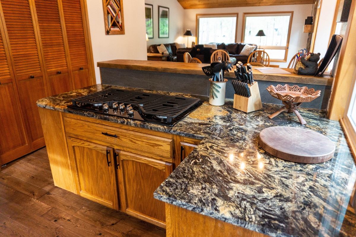 Unser schönes 1900 Quadratfuß Haus ist der perfekte Ort für deinen Urlaub. Unsere Küche verfügt über alle Geräte und gehobene Geräte, um Gourmet-Mahlzeiten zu kreieren. Das Hauptschlafzimmer mit Kingsize-Bett im Obergeschoss und 2 Schlafzimmer mit Queensize-Betten unten teilen sich ein Badezimmer. Wir haben Fahrräder und Tischtennis und TV in der Garage. Ein Weber-Grill auf der Terrasse, mit einem funkelnden, sprudelnden Whirlpool. Die Terrassen sind sowohl nach Osten als auch nach Westen ausgerichtet, also Morgensonne und Abendsonnenuntergänge. Hundefreundlich! (Limit: 2 Hunde). Wärme dich nach einem unterhaltsamen Skitag am Mt. Bachelor an unserem großen Kamin auf.