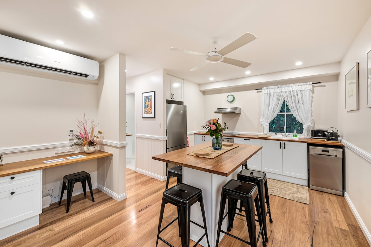 Bewundere den Blick auf das Küstenlaub vom Grillplatz unseres geräumigen 6BR-Pavillons aus. Die Gegend verfügt über 3 voll ausgestattete Pods für deine Familie und Freunde, um zusammen zu sein, während du persönliche Wohnbereiche erlaubst. Jeder Pod verfügt über Smart-TVs, Kaffeemaschinen und kostenfreies WLAN. DeZen ist ein toller Ort, um deinen nächsten Anlass zu beherbergen, wie eine intime Hochzeit oder Geburtstag oder einfach nur Zeit mit den Menschen zu verbringen, die du liebst. Unser Anwesen liegt in unmittelbarer Nähe zu Prestigestränden, nur 50 Minuten von Brisbane City entfernt.