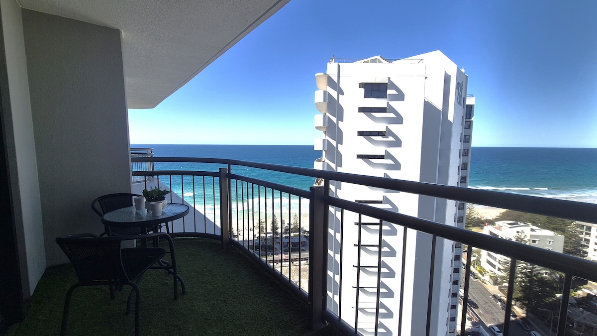 Bewundere die herrliche Aussicht der Eckwohnung mit Blick auf den glitzernden Ozean. Die Unterkunft befindet sich im fünften Stock, hoch genug, um den Strandblick zu genießen, niedrig genug, um das geschäftige Treiben auf der Straße zu genießen, 10 Gehminuten vom Unterhaltungsviertel Surfers Paradise, Märkten, Einkaufsmöglichkeiten, Restaurants und Clubs entfernt, gegenüber dem von Surfers Paradise patrouillierten Strand. Stadtbahnhof 8 Gehminuten entfernt. Die Wohnung verfügt über einen Smart-TV, verbinde dein Netflix, Apple TV usw.