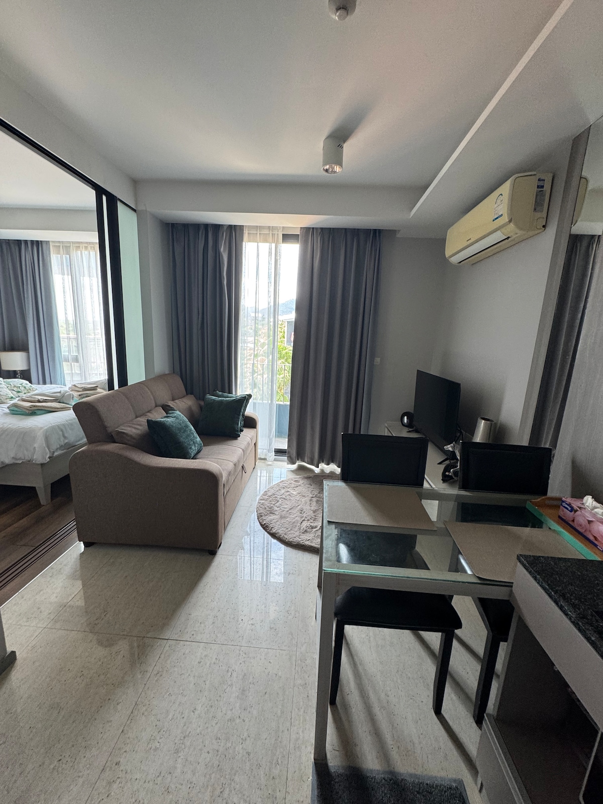 Wachen Sie in diesem hellen Studio am Surin Beach, nur 650 m vom Sand entfernt, mit Blick auf die üppigen Berge durch raumhohe Fenster auf. Nach einem Tagesausflug kannst du im Pool auf der Dachterrasse mit Meerespanorama schwimmen, ins Fitnessstudio gehen oder dich im Co-Working-Hub konzentrieren. Dein privates Nest bietet zwei flüsterleise Klimaanlagen, ein Kingsize-Bett, Verdunkelungsvorhänge, einen großen Smart-TV, 500 Mbit/s WLAN, eine voll ausgestattete Küchenzeile und eine Waschmaschine. Smart-Lock-Selbst-Check-in; Wasser und Strom inklusive.