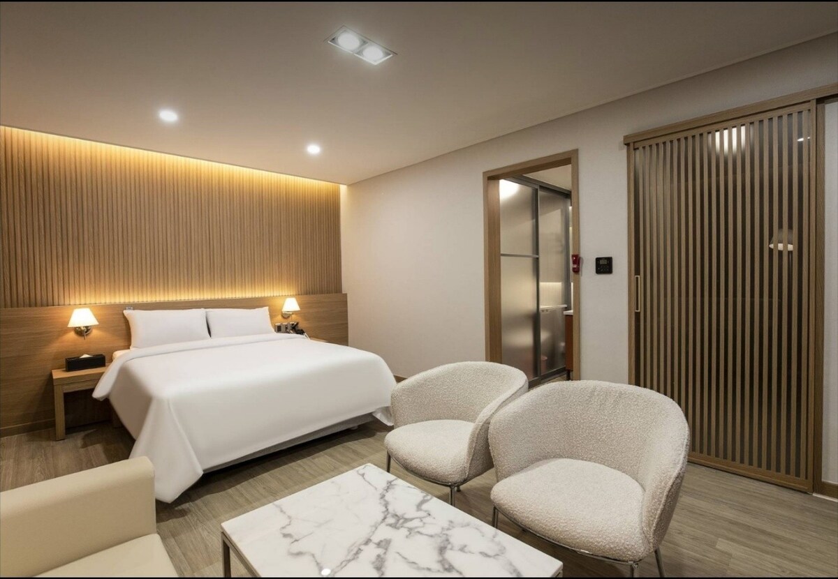 Es ist ein modernes Gebäude mit Zimmern in Form eines Einfamilienhauses im zweiten Stock und einem Grillplatz im Freien. Es hat eine komfortable Zimmerstruktur wie ein Hotel und einen 65-Zoll-4K-QLED-Fernseher vor dem Motion Bed, was die optimalen Bedingungen für das Ansehen von Filmen bietet. Das Rauchen ist in den Zimmern verboten und das Kochen von Speisen, die Rauch entwickeln, ist nicht erlaubt. Der Außengrill hat auch eine unabhängige Struktur und ist eine Unterkunft, die von Lichtkünstlern betrieben wird, so dass Sie tolle Innen- und Außenbeleuchtung genießen können. Neben dem Hongcheon-Fluss gibt es viele nahe gelegene Touristenattraktionen wie den Vivaldi-Park, die Palbong-Touristenattraktionen und die Schafherdenfarm. Dies ist ein Zimmer nur für zwei Personen. Haustiere sind nicht erlaubt. (Es ist möglich, bis zu 3 Personen zu beherbergen, aber es fallen zusätzliche Kosten an, die Sie uns im Voraus mitteilen müssen.) Es gibt insgesamt 4 Zimmer, von 201 bis 204, die in der Reihenfolge der Reservierung zufällig zugewiesen werden. Die Raumgröße und die Einrichtungen sind alle gleich und es gibt nur geringfügige Unterschiede in der Hauptbeleuchtung. Wenn Sie Komfort, Sauberkeit und Modernität mögen, werden Sie es nicht bereuen. Check-in 15:30 Uhr Check-out 11:30 Uhr