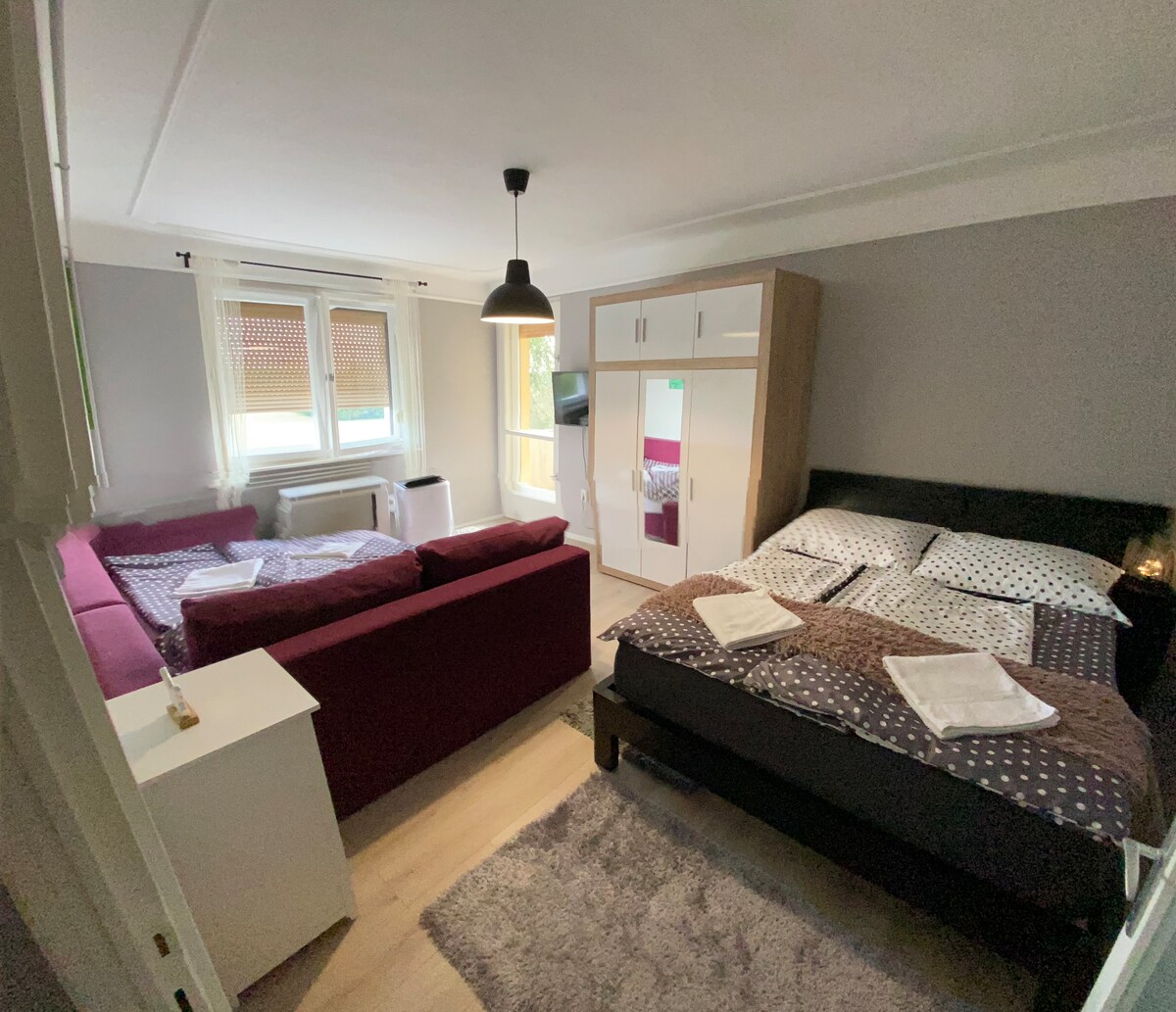 Die brandneue moderne 2-Zimmer-Wohnung befindet sich in der Nähe des Zentrums von Čakovec. Sie verfügt über ein Schlafzimmer mit einem Doppelbett, ein Schlafzimmer mit zwei separaten Betten und ein Schlafsofa im Wohnzimmer, ein Badezimmer und eine Küche. Die Wohnung ist klimatisiert, modern eingerichtet und verfügt über einen Flachbild-TV (im Wohnzimmer und Schlafzimmer) und kostenfreies High-Speed-WLAN/LAN. Privat- und kostenlose Parkplätze stehen in der Garage des Gebäudes zur Verfügung.