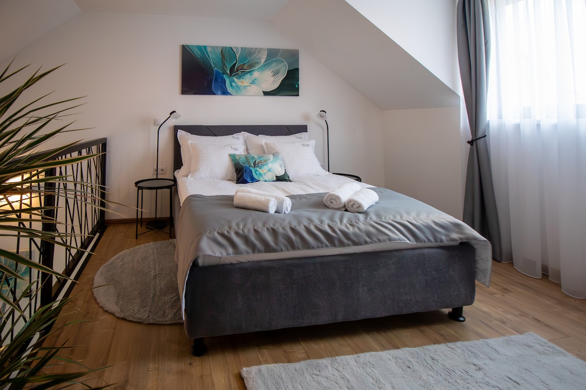 Wir bieten 4 Apartments 750 Meter vom Hajdúnánás Spa entfernt. Alle unsere Apartments verfügen über 3+1 Betten, jedes mit eigener Küche und eigenem Bad, ausgestattet mit neuen Möbeln und neuen Matratzen. Die Unterkunft ist für Kinder bis 3 Jahre kostenlos. Eine halbe Stunde von Debrecen, dem Sóstó Zoo in Nyíregyháza. 1 Stunde zum Nationalpark Hortobágy, Tokajer Berge. Klimaanlage, WLAN, privater Parkplatz. 750 m vom Thermalbad entfernt 4 Apartments, jeweils für 3+1 Personen mit eigener Küche, Bad Klimaanlage, WLAN, kostenlose Parkplätze. MA25112246